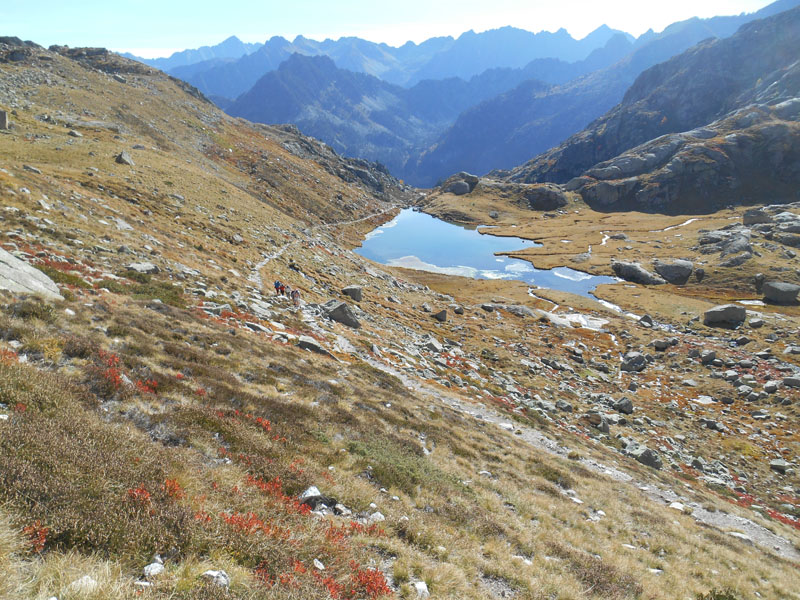 Nous rencontrons le premier des lacs de l'Embarrat (2078 m.), magnifique miroir d'eau,où les montagnes reflètent leur parure et leur silhouette. Le lac de Pourtet est aussi splendide. Nous marquons une halte, le regard dans le bleu de ses eaux. Nous abordons une nouvelle montée pour le col de Bassia, atteint vers 12 h 30 . De nombreux sommets se découvrent ; le pic du Midi de Bigorre, le Néouvielle, le Chabarrou, le Vignemale, etc.