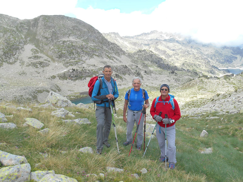 Nous atteignons le col de Couradette à midi. La vue porte à l'horizon ouest, où nous observons le refuge de Campana de Cloutou et le lac. Nous descendons au bord du lac de Li, immense baignoire aux eaux claires et déjeunons face aux cimes.