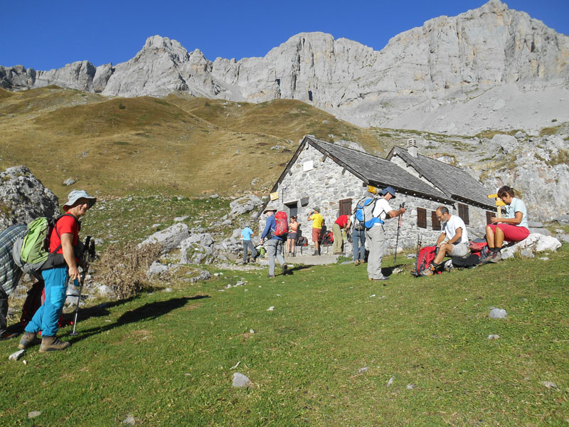 Après Lescun, nous nous arrêtons à Labérouat. A 8 h 50 nous marchons dans le bois de Braca d'Azuns. Les feuillages d'automne nous protègent de la chaleur. Par le vallon, le GR10 nous amène à la cabane de Cap de la Baitch (1689 m). Il est 10 h, nous marquons une pause collation. Nous sommes entourés par de magnifiques cimes, des Orgues de Camplong, au Billare, pic de Countendé, pic d'Anie, Soum Couy, etc.
