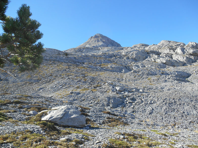 Nous montons dans un monde minéral, passant entre les lapiaz et cherchant les passages parmi des cairns éparpillés. Nous remarquons le cheminement à l'ouest qui contourne le pic d'Anie. Nous escaladons une cheminée de quelques mètres et retrouvons un sentier qui se dirige vers le sud, puis l'est, par une arête. Nous la suivons et celle-ci nous transporte au sommet du pic d'Anie à 12 h 25.