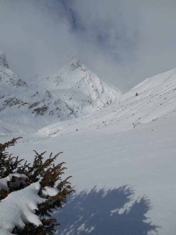 La descente est glacée. Nous retrouvons nos amis et Frédéric qui arrive. Tous les cinq, nous plongeons dans les pentes, dans une neige poudreuse, qui ravie nos spatules, mais un peu moins les jambes. Cécile skie avec style. Nous parvenons à la cabane d'Arizes (1746 m.), où nous déjeunons.Le soleil réapparaît.