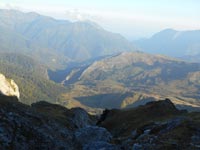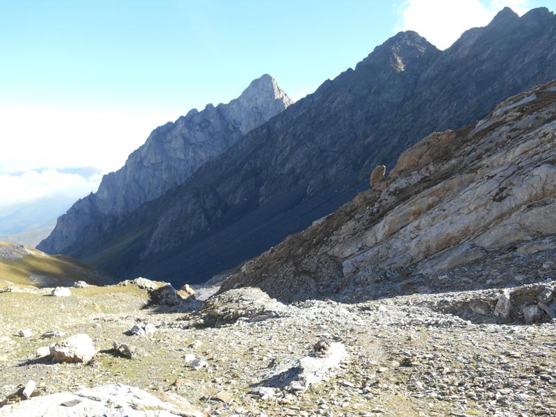 À 8 h 30, nous grimpons par le sentier raide, dans le bois L'Escale. Le soleil brille au-dessus des cimes, se moquant des nuages. Après la rude montée, nous débouchons dans le vaste vallon de Larue. Entre verdure et pierrier, nous cherchons le sentier et les cairns, tout en nous élevant progressivement, entre les contreforts de La Latte de Bazen, à l'ouest et ceux du Petit Gabizos, à l'est. Au sud, le pic de Louesque tente de nous séduire. Nous parvenons au col de La Neige (2542 m), à 11 h 30. Les vallées du Tech et d'Ausseilla, se devinent à travers le brouillard. Les pics du Balaïtous, Palas, ou Gavizo Cristal résistent au voile des brumes.