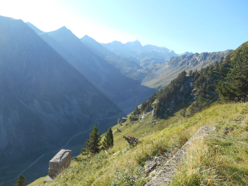 A 8 h 20, entre les anecdotes amusantes de Philippe C. et les discours détaillés à profusion de Philippe B, nous montons sur la piste forestière qui fuie par de larges lacets, jusqu'à la gare, en ruine, de l'ancien funiculaire. Nous profitons d'une belle vue, vers le pic du Midi de Bigorre et la vallée de La Glère.