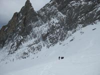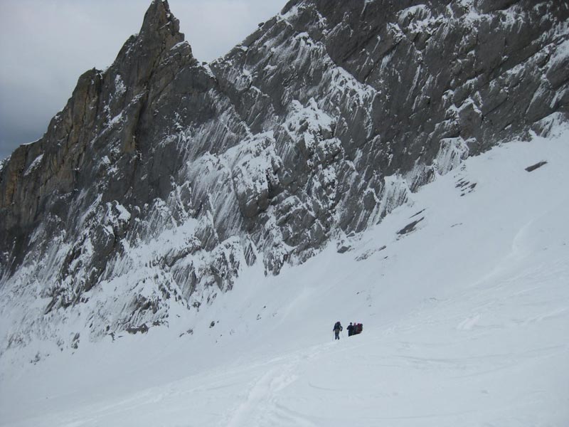 Le dimanche, nous sommes 5 à partir dans la voiture de Philippe, avec Jackie, Cécile qui a proposé cette sortie et Cédric. La température est de – 5° et le ciel couvert. A 9 h, nous montons prés des canons à neige, en longeant l’arête du Pène Sarrière. Comme un projecteur, le soleil illumine les Crêtes Blanches.