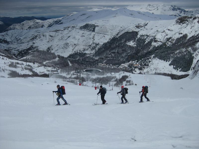 Nous descendons dans ce jour blanc, qui masque le relief. Par chance la vue s’améliore. Nous skions près du Pène Sarrière. La neige poudreuse est agréable à skier, mais par endroit sans couche, au risque de toucher les rochers. Nous parvenons en bas de la station, enchantés de ses premiers contacts avec le ski et la neige.