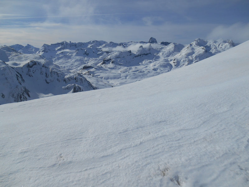 Enfin, à midi, nous parvenons sur la crête de Moustardé. Nous la suivons vers l'ouest et nous nous arrêtons sur une pointe à 2052 m.. Le vent est trop fort pour poursuivre. Nous jetons un regard panoramique du Peyrelue, Anayet, pic du Midi d'Ossau et après avoir retiré les peaux des skis, nous nous lançons dans les pentes, tantôt gelées, tantôt croûtées. Les virages sont souvent plein de surprises et nous louvoyons dans les combes.