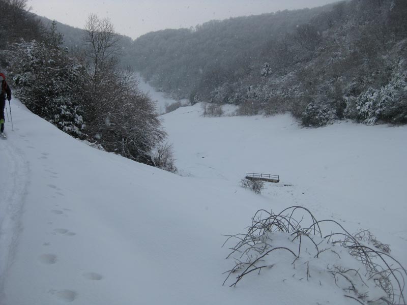 Nous sommes 12 skieurs, à partir à 7 heures du matin, malgré un temps maussade, vers la vallée d’Ossau, renonçant au secteur de Berlagne, pour cause de routes enneigées. Depuis le Port de Castet, à 8h25, Ghislaine nous entraîne sur la piste qui défile entre le bois de Labétet et le bois Padoen.. Le ciel blafard se laisse animer par les flocons de neige qui virevoltent dans des danses dispersées et brouillonnent.