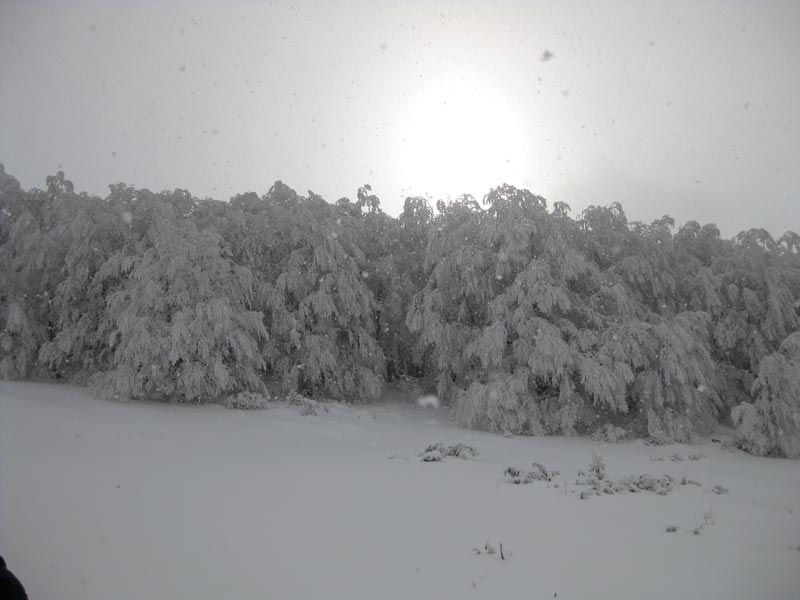 Quittant la piste, les passages se redressent et nous amènent sur un vaste vallon. Le groupe s’étire aux grés des pentes et des replats qui permettent les rassemblements et la prise, attendue, d’une collation. Dans le secteur de Costabuzy, longeant le bois, nous nous élevons sur une forte pente exigeant d’effectuer de nombreuses conversions. Nous suivons une clôture de fils d’étoile de neige, disposés comme des dentelles tapissant le paysage. C’est ainsi que nous parvenons au sommet de Sésérite. Les brumes se dissipent et laissent deviner la beauté d’un décor aux parures de blanc.