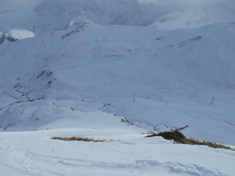 Enfin nous arrivons au col de Lary, à midi. Le ciel se couvre lentement de nuages et le pic de la Montagnette au programme, disparaît dans les brumes, comme un jour blanc. Alors nous montons sur la crête est. Comme la neige n'est pas très stable, nous nous espaçons.