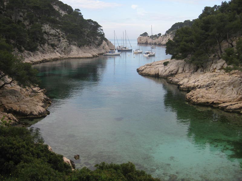 Le lendemain, avec Andrée, nous effectuons une grande boucle du Col de la Gineste (326 m), nous remontons au col Ricard. Le sentier retombe dans la végétation, puis se redresse, pour nous entraîner au col de la Candelle (501 m). Nous dominons la mer et les calanques de l'Oeil de Verre, des Pierres Tombées et de Sugiton. Le spectacle est grandiose.