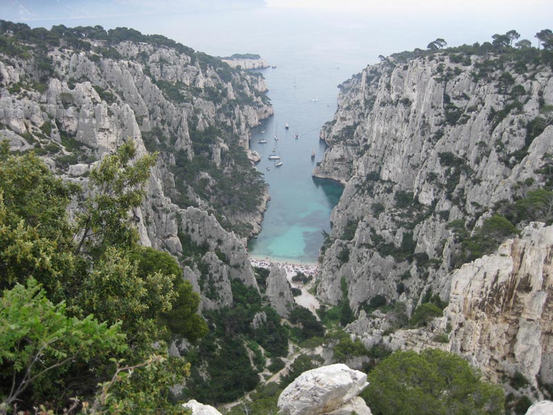 Nous dominons la calanque de l'Oule, sauvage, peu parcourue, alors que la foule envahie la calanque d'En Vau et les bateaux s'accumulent. A l'Est, les falaises de Cap Canailles s'élèvent des brumes. La pause repas terminé dans ce magnifique panorama, nous repartons pour retrouver la foule sur la plage d'En Vau. Nous nous baignons. C'est bien agréable après les efforts de la randonnée !