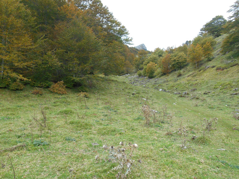 Nous ne pouvons franchir le plateau du Bénou pour cause de courses à pied. Encore un changement ! C'est donc du plateau du Houndas que nous partons à 9 h, sous un ciel très nuageux, mais une température élevée. Le sentier grimpe dans le bois de Labaigt Dauste. Nous traversons des prairies, en fortes pentes, ce qui n'empêche pas les filles de papoter, mais d'avancer aussi et nous arrivons à la cabane de Crambots, fermée. Il est 10 h 15, nous marquons une pause grignotage.