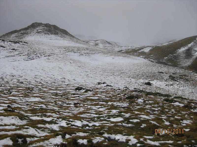 Un sommet, proche, attire notre convoitise. En quelques minutes nous l’abordons, en foulant une pellicule de neige. Le paysage présente le même aspect, mais le vent nous refroidit.
