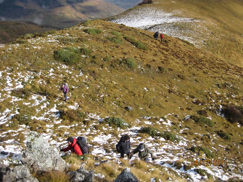 Le chemin sinueux, nous entraîne prés d’une première cabane, puis celle de l’Ourtiguet, mieux aménagée. Pierrot propose de monter au col et la crête. Passant par des rochers glissants, nous nous élevons ensuite, par les pentes herbeuses qui nous dirigent sur la crête de la Sède de Pan. Le panorama nous présente les villages de Bilhères d’Ossau et Castet, au nord. Nous remarquons les flancs du Montagnon et le Mailh Massibé, perdus dans les nuages ;