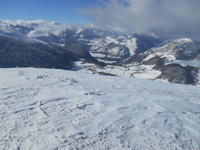 Nous franchissons les branches des arbres tombées, ou nous passons sous des voûtes de neige,formées par les branches. Parvenus au Port de Castet, les cimes se dégagent. Ghislaine décide de nous mener au Soum de La Pale. Après le bois de La Bouchère, nous attaquons la pente vers le col de Lamuretch. Olivier, Ghislaine et Benoît, s'alternent pour la trace. Nombreuses conversions et larges lacets, nous amènent au col, puis au Soum de La Pale, atteint à 13 h 30. Le soleil éclaire le relief et nous déjeunons, admirant ce paysage, du pic La Peyrie, à l'est,le Durban, au sud le pic du Moulle de Jaut, la plaine blanchie et les petits villages, comme des maquettes. Le sommet n'est donc pas si pâle !