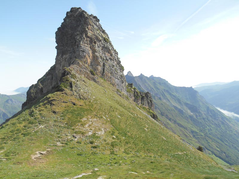 Nous poursuivons la crête vers le sud sud-est à la recherche d'un sentier où de cairns indiquant un passage pour le pic de l'Arcoèche. Nous nous engageons sur des pentes raides, herbeuses et caillouteuses, utilisant des rochers pour nous hisser. Mais l'ascension est imprécise. Je ne trouve aucun repère.