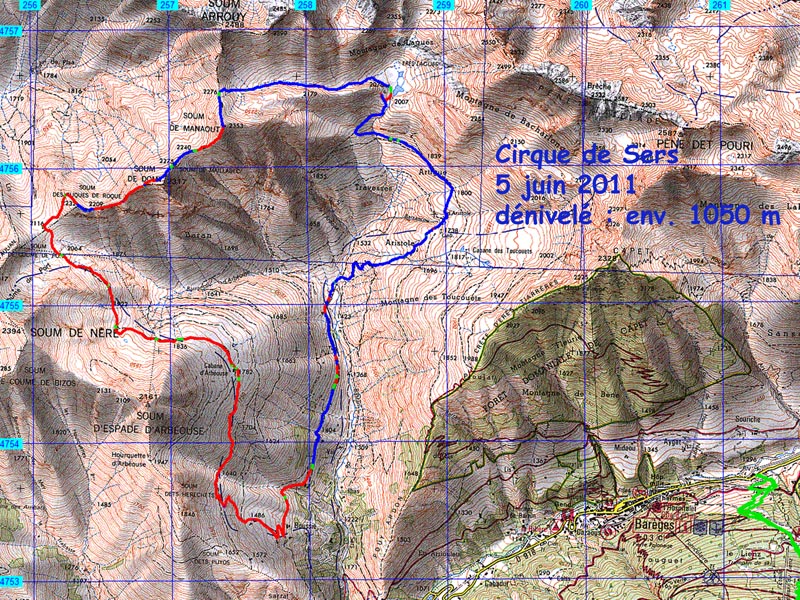Sortie CAF : Vallée de Barèges – Crêtes du Cirque de Sers- Départ : 1404 m. – Soum de Domy : 2317 m.- Soum de Maillabec : 2275 m. – Soum de Manaout : 2353 m, en boucle.