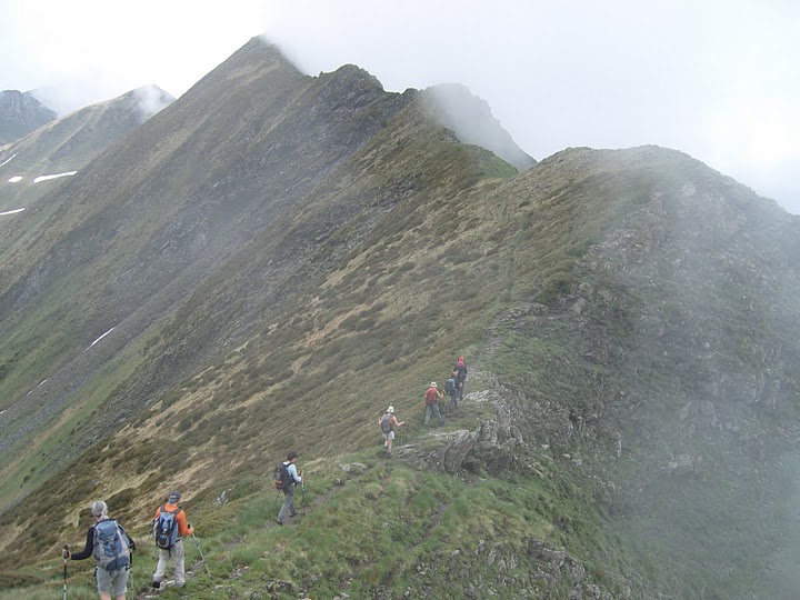 Nous franchissons le Soum des Tuques de Roque (2232 m.) et nous nous élevons au Soum de Domy. Nous repérons le Pène Det Pourri. Nous grimpons au Soum de Maillabec (2275 m) par un passage aérien, exposé au vide. Après ce sommet nous descendons, pour repartir dans l’ascension, raide, du Soum de Manaout, que nous atteignons à 11h 45, dans les brumes célestes.