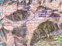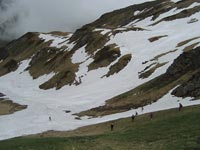 Nous déjeunons sur le sommet herbeux. Dans la descente, après les pentes herbeuses, nous parvenons sur un long couloir de neige qui se prête à la glissade. Chacun fait son cirque ! Nous dépassons un étang et parvenons à la cabane Toucouets (1817 m). Nous dévalons dans le relief raviné, où coule le ruisseau de Hourcade. Juste après, la pluie tombe en averse En vingt minutes nous parvenons sur le parking, à 14h 30. Malgré un temps passable, cette découverte du cirque fut magnifique.