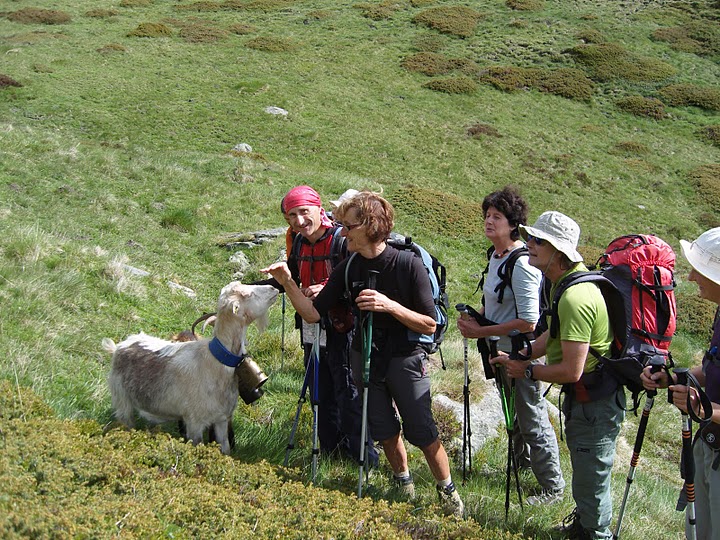 A 8h25, nous cherchons une autre piste, qui nous amène, peu à peu, à la cabane d’Arbéouse (1782 m.), sous le Soum de Nère. Un troupeau de chèvres nous accueille. Elles sont très affectueuses avec certain(e)s. L’allure est régulière, lorsque nous attaquons une pente rude qui se dirige vers la crête d’Aulian et s’échappe sur le Soum de Coume de Port (2317 m.). La vue sur le Cirque de Gavarnie est masquée par les nuages qui accrochent les sommets.
