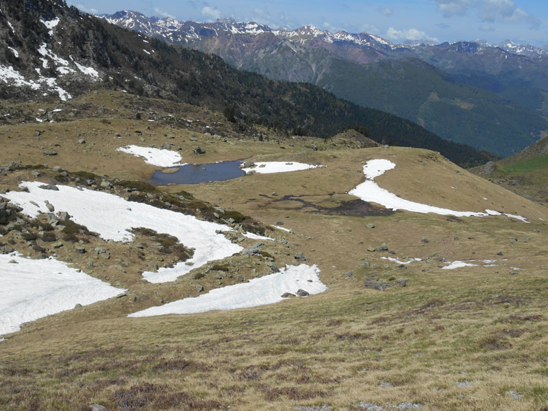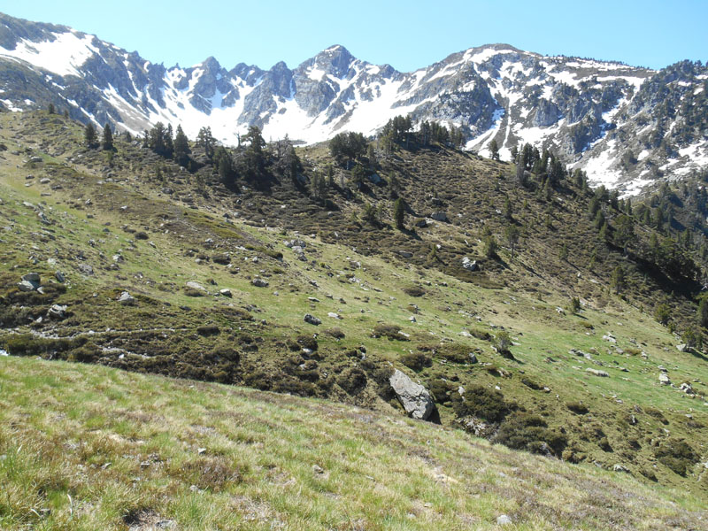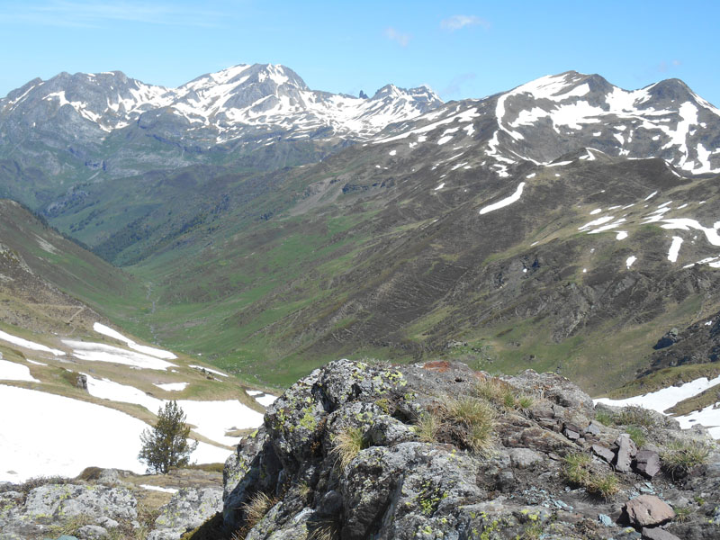 Vers 13 h 15, nous repartons, traversant le névé, puis basculant au sud-ouest, pour aborder les pentes raides, évitant les névés. Nous franchissons les ruisseaux, prenons des pentes hors sentier, pour parvenir au refuge de Larry.Le retour est rapide. Nous dépassons le groupe de randonneurs. Nous fonçons dans la forêt n'hésitant pas à prendre des raccourcis. La chaleur augmente et les nuages arrivent du sud-ouest. Il fait meilleur dans les bois. Le sentier nous conduit sur le chemin de pierres et de buis et nous parvenons au pont de Larry à 16 h. Ainsi nous avons randonné entre deux très belles vallées !