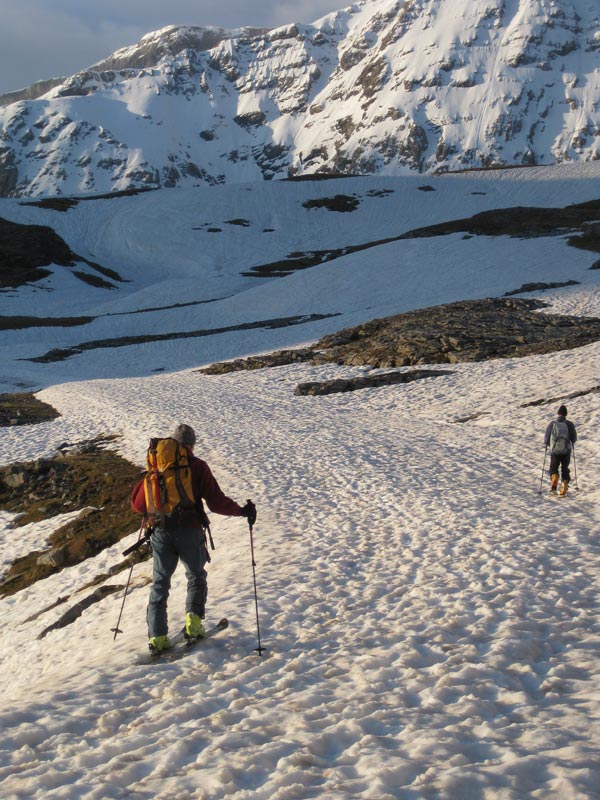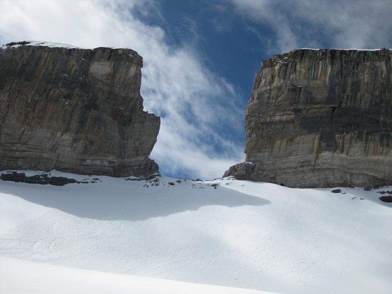 Nous traversons le vaste vallon des Gabiétous et attaquons la forte pente en neige gelée, au-dessus de la cascade qui nous amène au col des Sarradets (2589 m). Passant vers le haut du refuge des Sarradets, nous grimpons le long du glacier de la Brèche, multipliant les conversions. A 11h nous atteignons la Brèche de Roland (2807 m.).