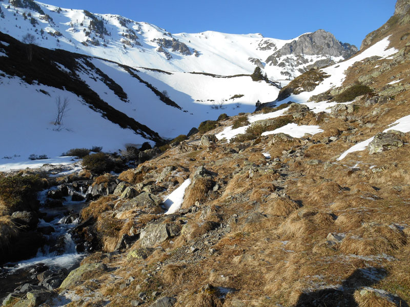 Le rythme est très rapide et des arrêts de quelques secondes évitent les chutes. Nous filons dans le vallon d'Auloueilh, choisissant les pentes en bonne neige, même si celle-ci, fondante, commence à être lourde. De la berge sud, nous traversons la gorge où coule le ruisseau le Lavedan, le cheminement étant plus au nord-est. Nous rechaussons sur quelques dizaines de mètres pour atteindre le sentier. Puis c'est le portage, à nouveau des skis et la longue marche qui nous entraîne aux granges de Lurgues, à 14 h 55.
