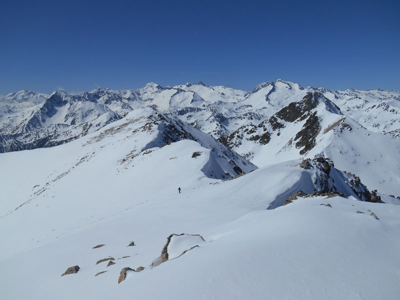 Une nouvelle montée, assez raide, traverse la Serre d'Auloueilh, sous le pic de Bastan d'Aulon. L'avancée est rapide. Ghislaine, Martine et Dominique courent devant. Le soleil inonde de lumière le vallon enneigé et les crêtes qui se détachent dans un beau ciel bleu.