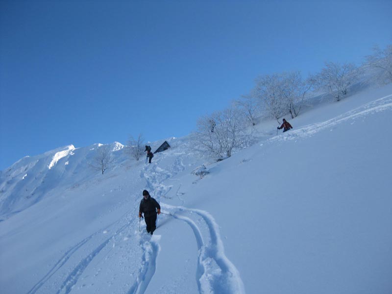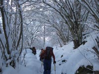 Sortis du bois, nous affrontons les pentes raides vers les Artigues. Nous rencontrons des cabanes perdues comme des îlots dans un océan de neige. Nous replongeons dans un petit bois vers le Turon des Longues et Ladérère. Se présente, alors un vaste vallon. La neige est de plus en plus abondante dans les pentes raides, où nous nous engageons. La trace est effectuée par les camarades entraînés, qui se relient .Après de grands efforts et une multitude de conversions, nous parvenons sur le col du Pic de Bergons, encore loin. Il est 13 h, nous déjeunons.