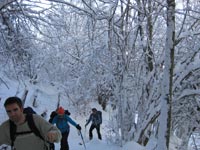 C'est par une piste forestière que nous montons, skis aux pieds et passons près des cabanes, pour ensuite nous faufiler, par un sentier, dans la forêt. La neige dessine des dentelles sur les branches des arbres. Le décor est féerique. La blancheur dentelée des étoiles de neige, explose vers le ciel azuré.
