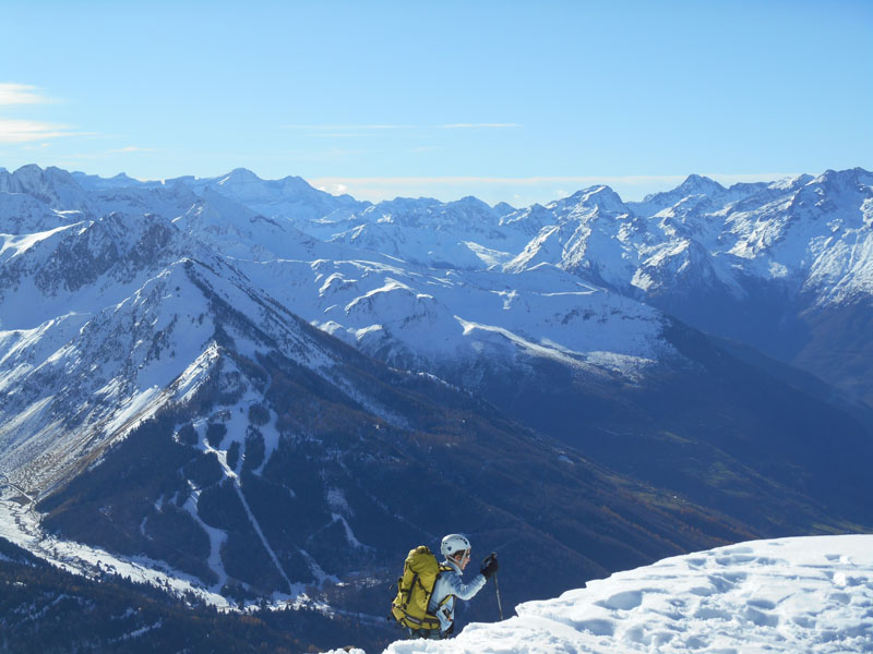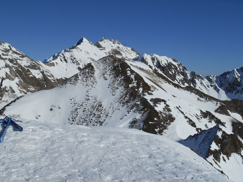 Un magnifique paysage éclate à nos yeux. Emplie de lumière, la neige accentue la luminosité, du Montaigu, au pic du Midi de Bigorre, du Néouvielle, au cirque de Gavarnie, de l'Ardiden, au Pène det Pouri, du Soum de Lascours au lac Bleu, en dessous de nous. C'est parmi ce paysage superbe que nous déjeunons.