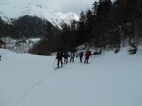 Nous descendons une pente bien inclinée, dans une neige lourde, qui entraîne quelques chutes, pour certains.La traversée du vallon de Bious nous force à pousser, sur les bâtons. Pour les passages de ruisseau, nous cherchons les ponts de neige.