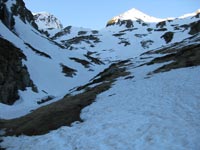 Nous partons à deux, avec Frédéric, à 6h du matin, dans la vallée d’Aure, à la recherche de lieux encore skiables. Nous parvenons au tunnel d’Aragnouet, en travaux. A 8h, skis sur les sacs à dos, nous montons sur le sentier au-dessus de la gorge. Ce n’est que 20mn plus tard que nous pouvons chausser les skis. Nous attaquons un couloir pentu, qui nous amène sur un vaste vallon inondé de lumière, dans le blanc éclatant d’une mer de neige, projetant ses écumes jusqu’au ciel azuré, sans la tâche d’un nuage.