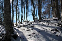 Vers 13 h nous repartons par la crête ouest vers le pic de Boun et le Pène de Souquette. Nous marchons dans la neige tout en admirant le paysage autour de nous. Dans le bois Le Bedat, les arbres apportent un décor féerique, avec les cimes en toile de fond. Nous descendons au gré du relief glissant sur la neige posée sur les feuilles.