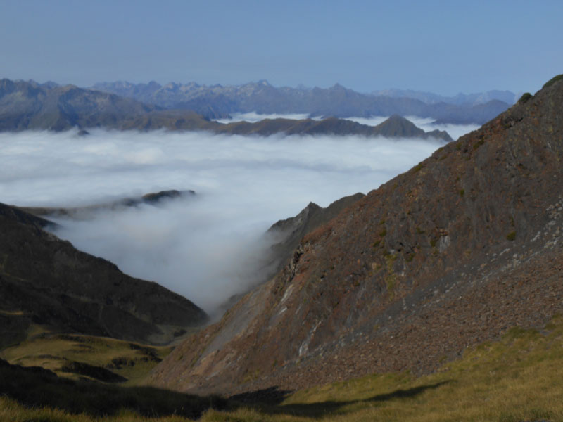 Le brouillard se dissipe. Le soleil apparaît. Un beau ciel bleu dessine les montagnes qui se découvrent. Le cheminement passe par l'Escala, monte entre la Grande Estibère et la Petite Estibère. Une courte pause est bien venue.