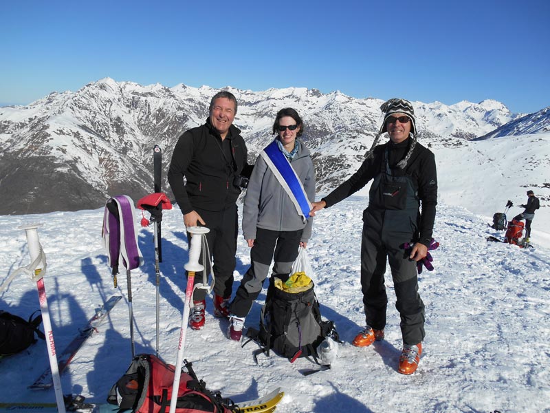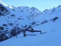 Nous déjeunons face à ce paysage baigné de lumière.Puis c'est la descente par la crête Est, aérienne et gelée.Du col, nous plongeons dans la face nord. La neige, mélange de glace, de poudreuse, lourde ou fluide,est difficile à skier.Elle devient agréable dans les vallons Barradé et l'Estibe.