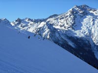 Le rythme est soutenu.Les pauses sont courtes. Nous nous éloignons des granges d'Abié, pour aborder des pentes raides un peu gelées. Multipliant les conversions, nous franchissons la crête et parvenons au pic de Bergons, à 12h 05. Le panorama est grandiose. Le cirque de Gavarnie déroule ses attractions des cimes du Piméné, Cylindre du Marboré, Tour ,Casque, Brèche de Roland, ou Chanchou, plus à l'ouest.