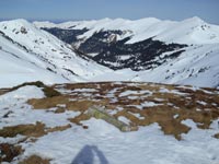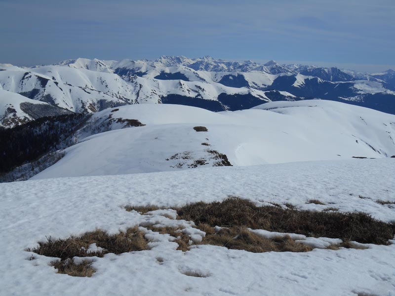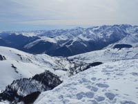 La descente du sommet, avec les peaux, sur neige gelée, me coûte une chute sur le nez. Ceci n'affecte pas mon flair et du col de Sahiestre ( 1878 m.), nous montons au Sommet de Pouy-Louby que nous atteignons à midi. Un complément de paysage se rajoute à celui prestigieux du sud et de l'Est, avec la vallée d'Oueil-Larboust et le Mont-Né.