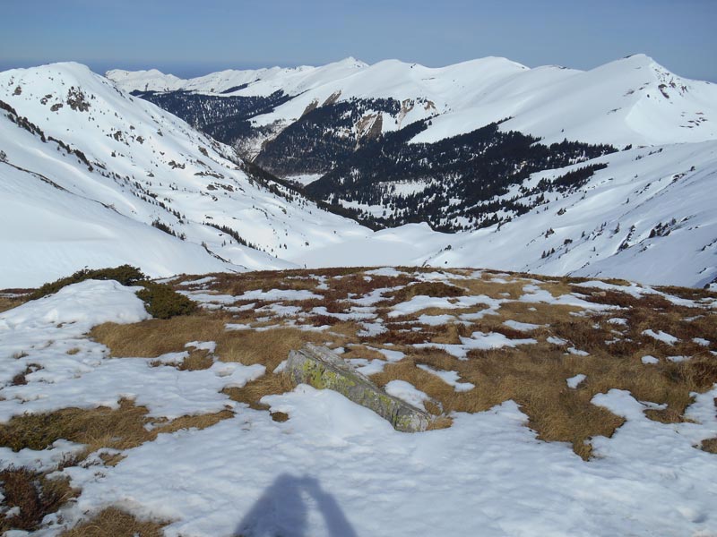 La plongée dans les pentes neigeuses s'effectue avec une surprise agréable, car la neige est excellente pour la glisse . Nous voguons sur cette mer de neige, franchissant les vagues du relief, comme si le vent nous promenait sur les flots. Nous parvenons sur la piste forestière, où nous filons comme des flèches et nous arrivons près du parking, à 14 h 30.