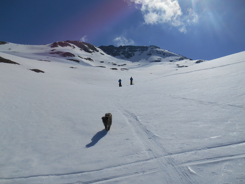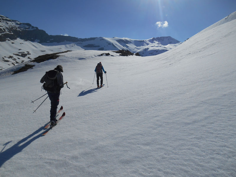 Enfin nous pouvons chausser les skis et mettre les couteaux, la neige est gelée. Malgré cela le vallon éclate des lumières scintillantes du soleil, qui jaillissent comme le bombardement d'un feu d'artifice, dans un spectacle d'effets pyrotechniques.