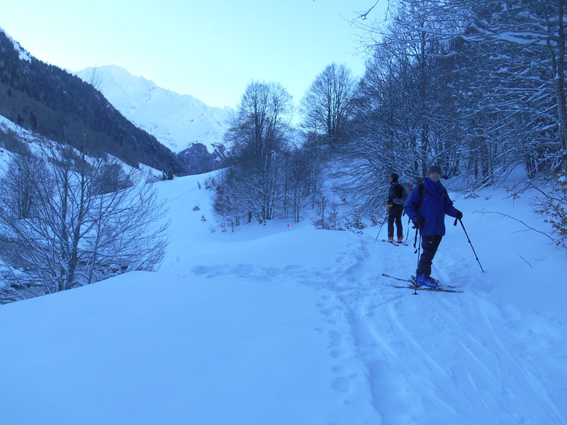 C'est l'encombrement au pont d'Oly. Nous partons avec Jean-Pierre B. et Philippe C., en vallée d'Ossau. Une barrière à Pont de Camps empêche le passage. C'est donc la piste de ski de fond que nous prenons à 9 h 15. La trace est à faire dans une neige abondante.
