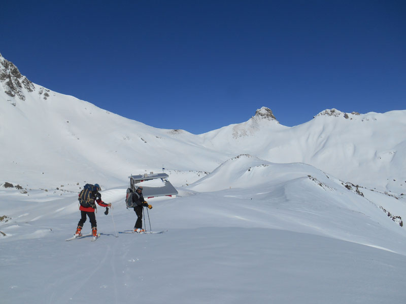 A 13 h 30 nous repartons dans la descente. Le ski dans les combes en bonne neige, malgré quelques plaques glacées, est agréable et permet des évolutions fantaisistes et osées. Nous passons par la cabane de Puchéou pour éviter les faux plats. La neige est gelée sur cette partie.