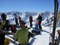 Après la cabane d'Arizes, nous skions en traversée et passons l'étroit goulot, alors que Bernard et quelques camarades tentent un passage par la droite. Du pont des Vaquès, nous rejoignons la piste jaune. La descente courte, mais raide clôture agréablement cette randonnée, à 14 h10.